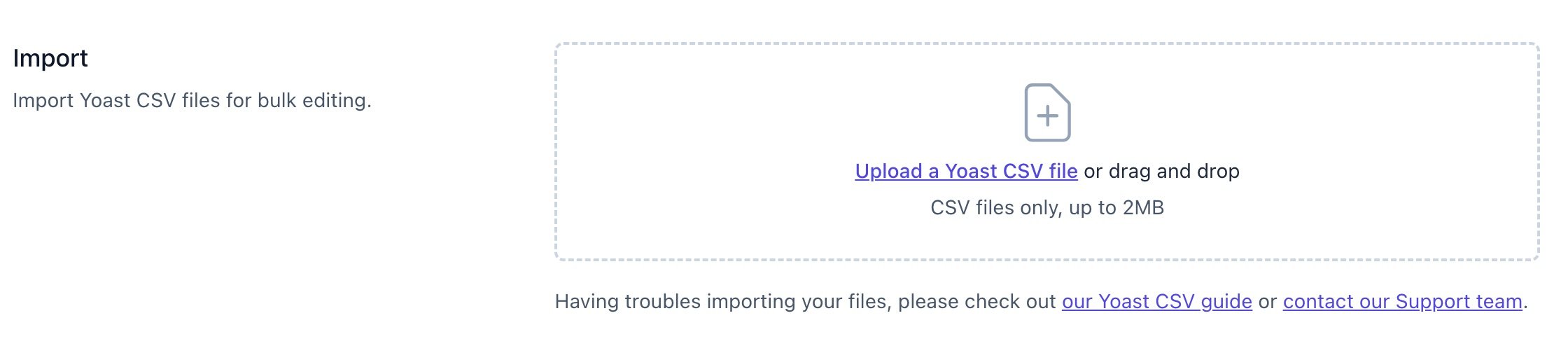 To be able to use the bulk editor in Yoast SEO, you’ll need to export your data, edit it and then import it back. To learn how to do that, follow these steps.