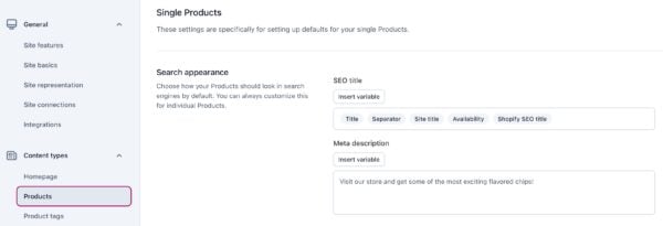 Under Content types, confirm that you’re happy with the variables chosen for the SEO title and meta description. These variables determine your content’s appearance in search results. If you leave these fields empty, our app will rely on data entered through Shopify.