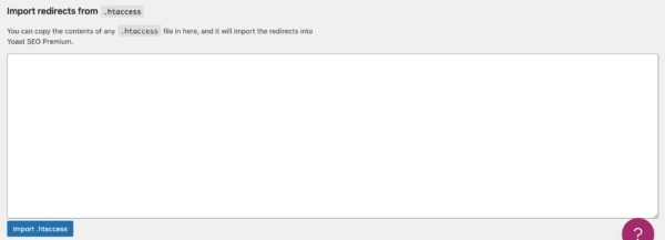 The third option is to import by copying the contents of a .htaccess file and pasting them into the text box. You can do this by copying the .htaccess file on one site and returning to Import redirects. Paste the file into the box and click the Import .htaccess button below the input field.