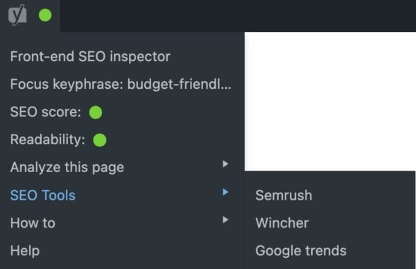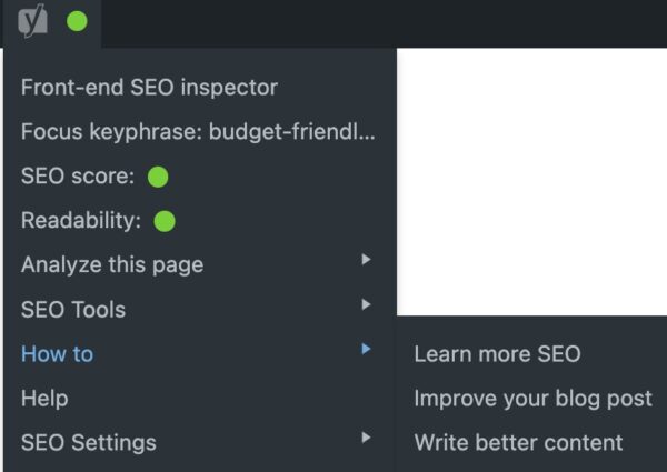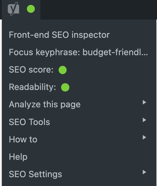 When you are logged in to your WordPress account and view or preview a page on the front-end, you will additional items in the Yoast SEO admin bar menu.