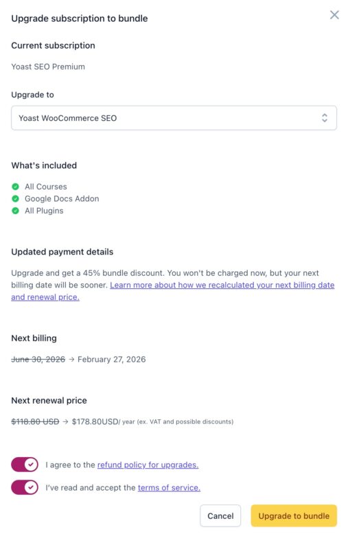 In the pop-up screen, you’ll see the details of the upgrade, including your current subscription, upgrade options, next billing date and next renewal price. Tick the boxes to agree to the upgrades refund policy and the terms of service. Then, click on Upgrade to bundle.