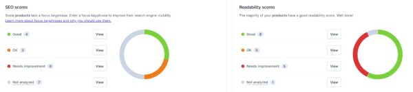 The Dashboard provides you a quick overview of your content and how well it is optimized. The analysis is available for Products, Collections, Pages, Blogs and Blog posts. Want to know what our SEO analysis means? Check out the details of all the assessments in our SEO analysis. Not sure what these Readability scores refer to? We explain all the ins and outs of easy-to-read content on our Readability analysis page.