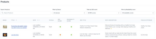Under Products, you can see an overview of all yourCollections and Products. Clicking on the individual content items takes you the editor where you can further modify your content. You can use the search function to search through all your items, or filter by SEO score and Readability score. For Collections, you can also filter by Availability; for Products you can filter by Status.