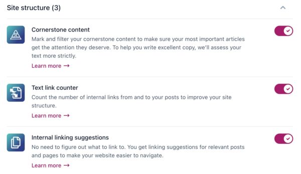 The next section in the Yoast SEO Site features settings is Site structure. So, let’s take a closer look at the features in the Site structure category.