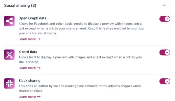 In addition to Open Graph data, X uses specific data to display information when your website’s content is shared on their platform: X card data. In the Site features settings, you can decide whether you want to output specific data for X or you want it to rely on just the social media data that you already gave it. It’s usually a good idea to keep this feature enabled.