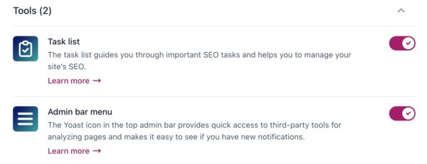In this section, you have the option to turn on or off the Yoast SEO admin bar menu. This menu provides convenient access to third-party tools and resources and allows you to quickly check for new notifications from Yoast SEO.