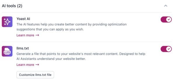 Under AI tools, you can enable or disable the Yoast AI features, as well as the llms.txt feature.