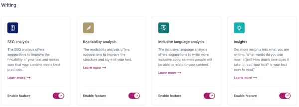 The inclusive language analysis offers suggestions for writing more inclusive copy. If you write more inclusively, you will open up your content to more people. This feature is opt-in, so it’s disabled by default. If you want to enable this analysis, you can do that by switching the toggle on this page. Read more on the importance of inclusive language for SEO and the categories the inclusive language analysis assesses.